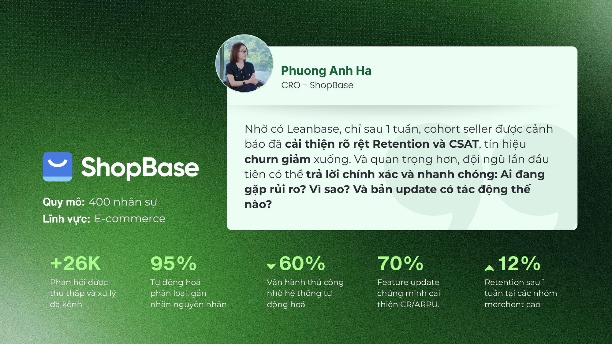 Leanbase Compass giúp ShopBase xây dựng một cơ chế lắng nghe chủ động: Giúp đội ngũ nhìn ra nỗi đau thật sự của khách hàng; Biến insight rời rạc thành quyết định tăng trưởng kịp thời; Chứng minh rằng chỉ 72 giờ cũng đủ để giữ chân khách hàng và củng cố niềm tin cho hành trình mở rộng toàn cầu.